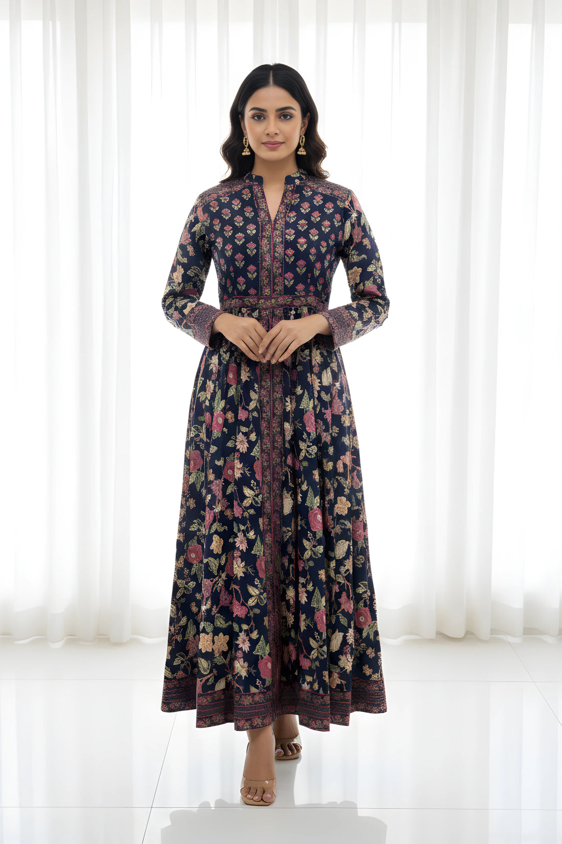 Navy Anarkali Cotton Hand Block Printed Ethnic Maxi Dress