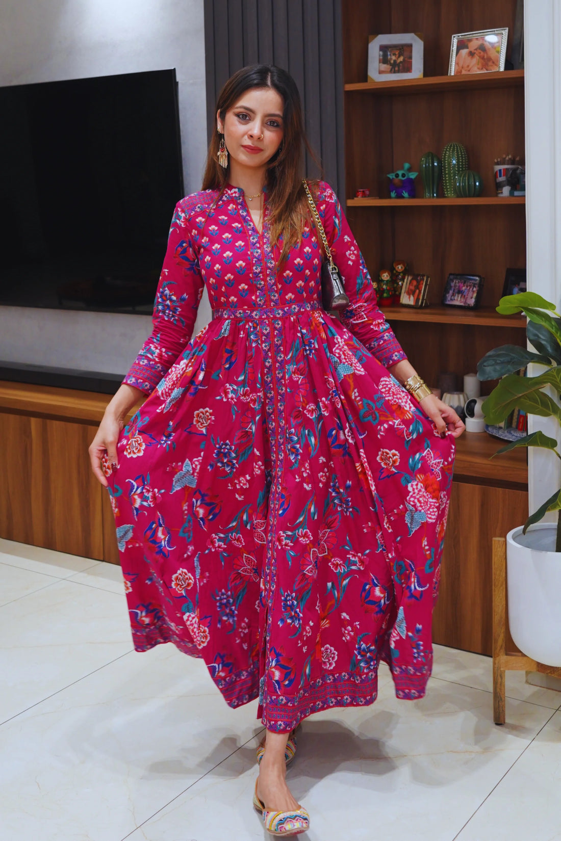 Dark Pink Anarkali Cotton Hand Block Printed Ethnic Maxi Dress