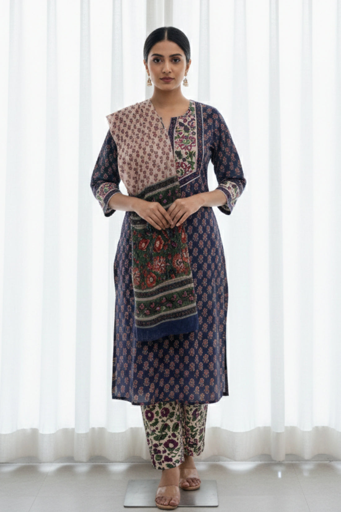 The dress material is pure cotton and very soft. Comfortable to wear. Color is a beautiful navy blue as shown in the image. However, the blue color bleeds, so has to be handwashed separately every time.