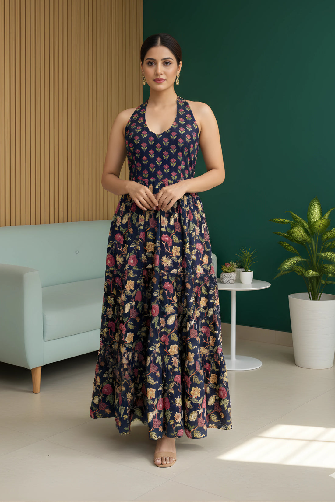 Blue Floral Hand Printed Halter Maxi Dress