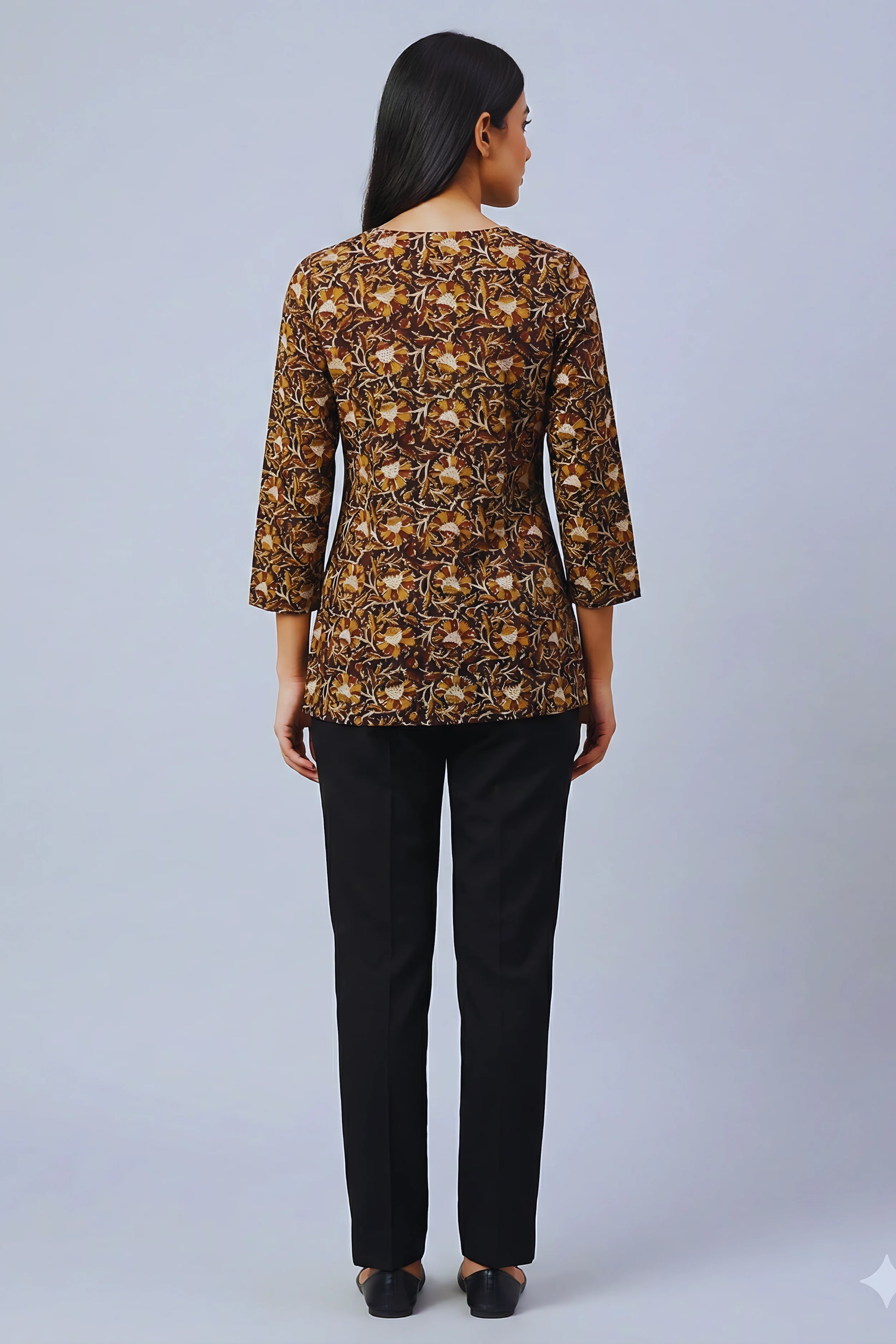 Stylish short kurti with an elegant all-over print, perfect to pair with jeans. Designed for daily wear with a comfortable fit and a clean neckline. Easy to style for work, casual outings, or everyday use. A smart fusion look that feels effortless and modern.