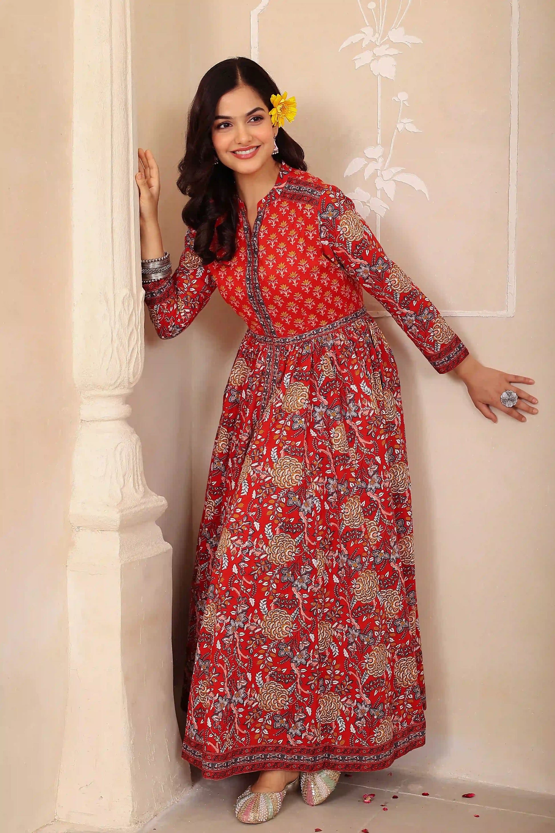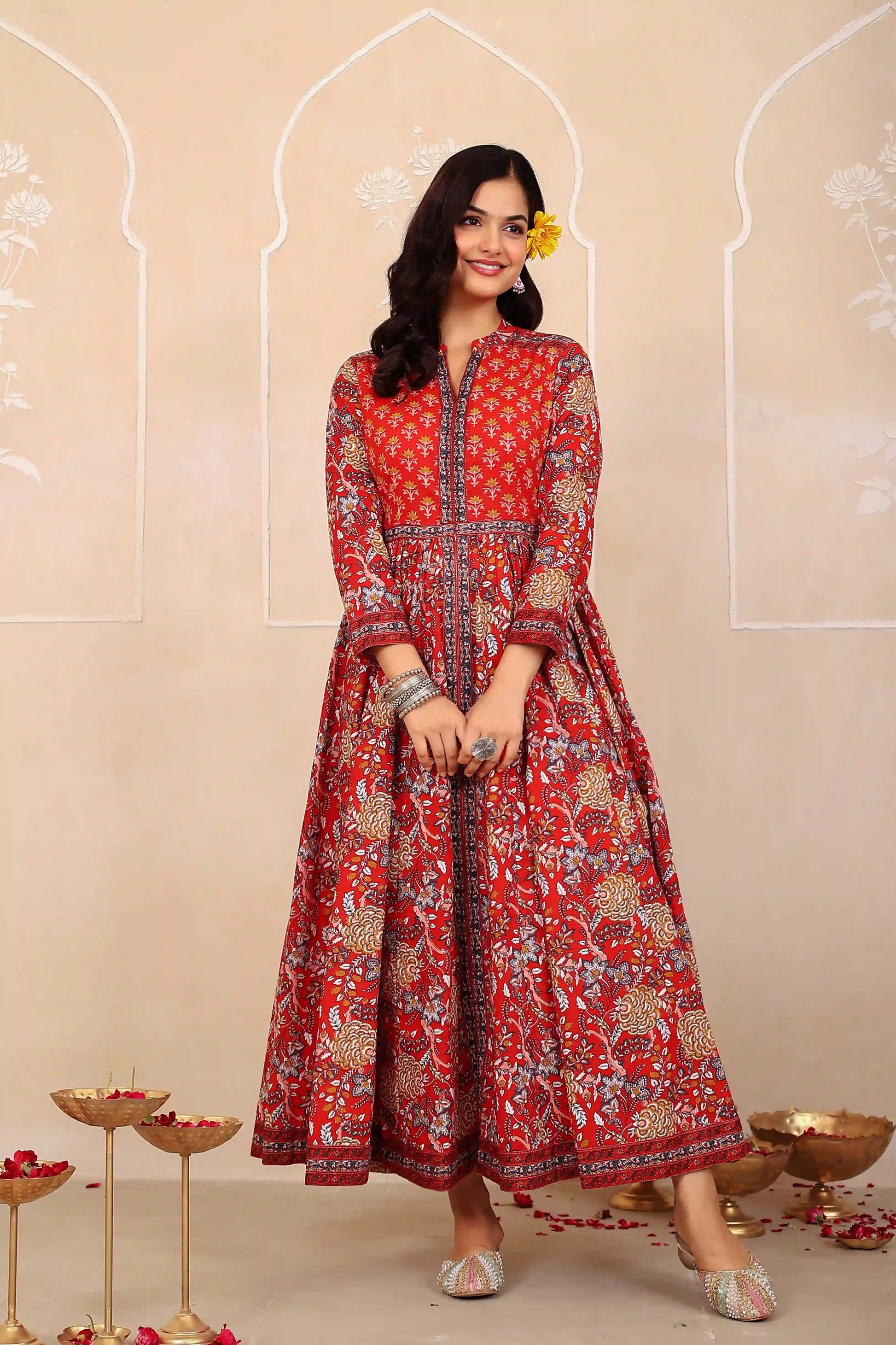 Dark Red Anarkali Cotton Hand Printed Ethnic Maxi Dress