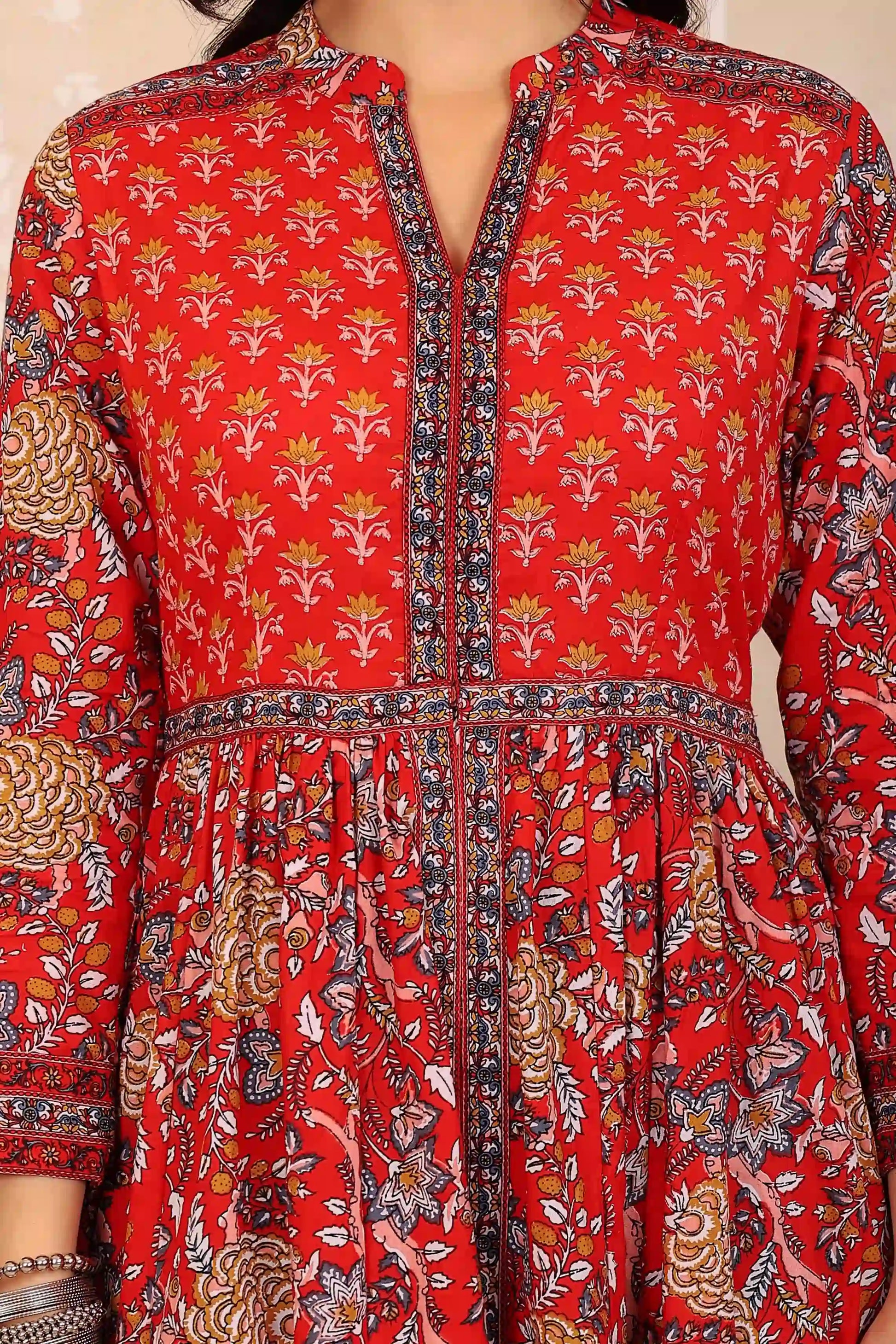 Gulab Chand Trends presents a vibrant red floral-printed dress with a matching inner. Featuring intricate patterns and a flattering fit, this dress combines elegance and comfort, making it a perfect choice for festive and casual occasions.