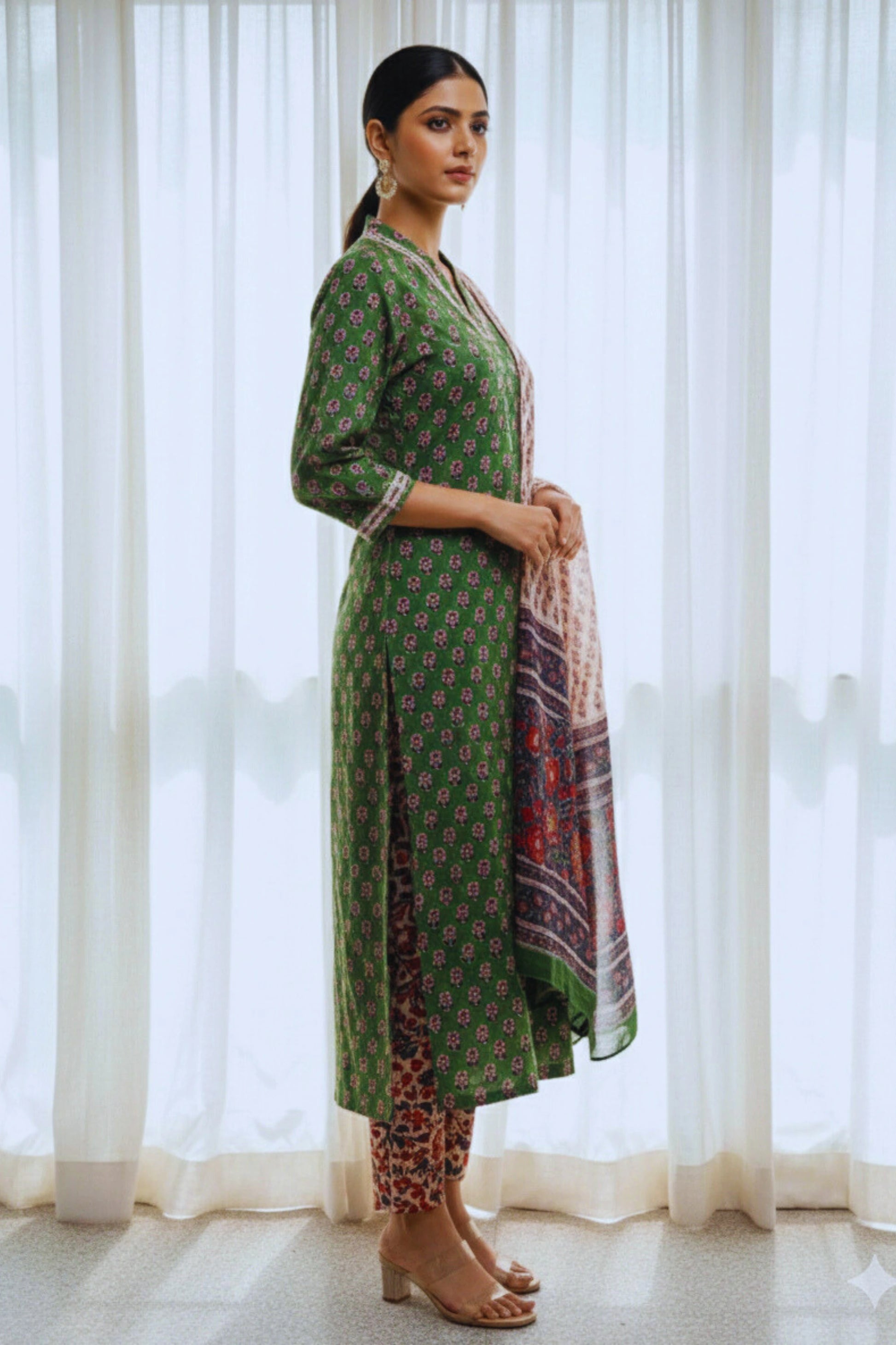 Green Hand Block Printed Straight cotton Kurta Set with Chiffon Dupatta