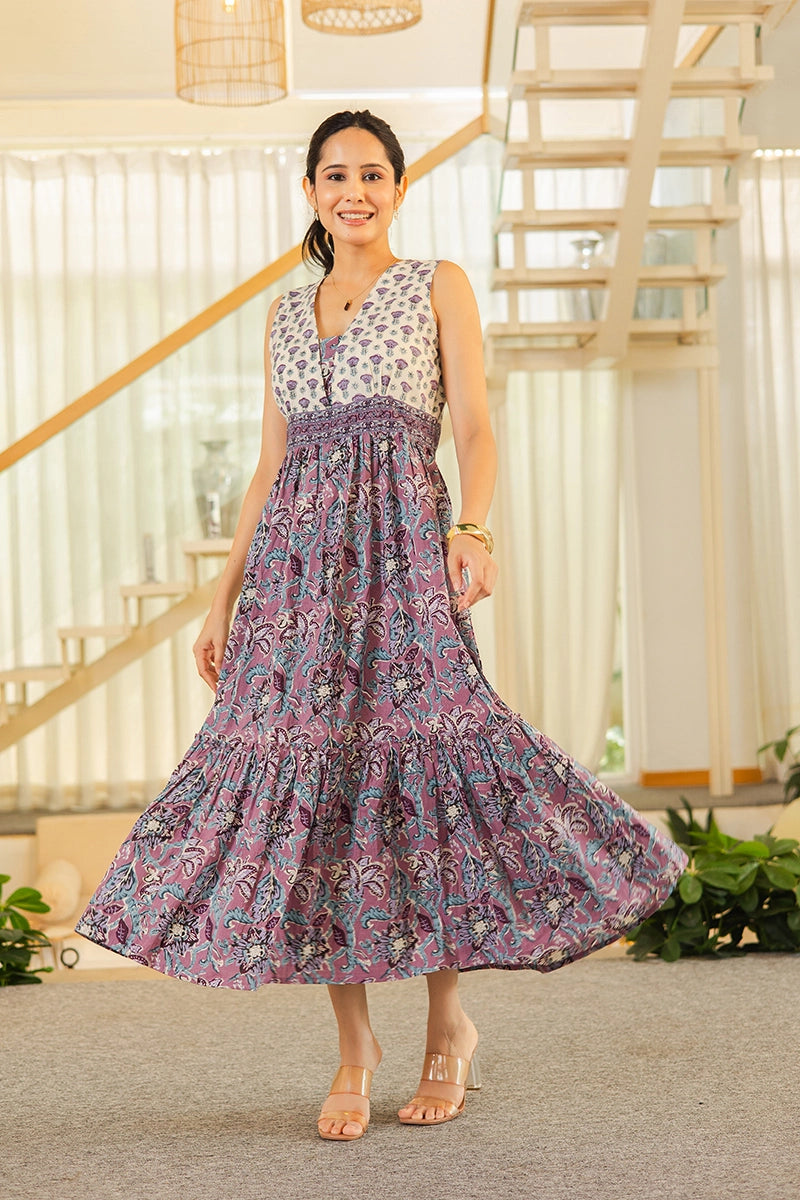 Light Violet Floral Hand Printed Cotton Sleeveless Dress