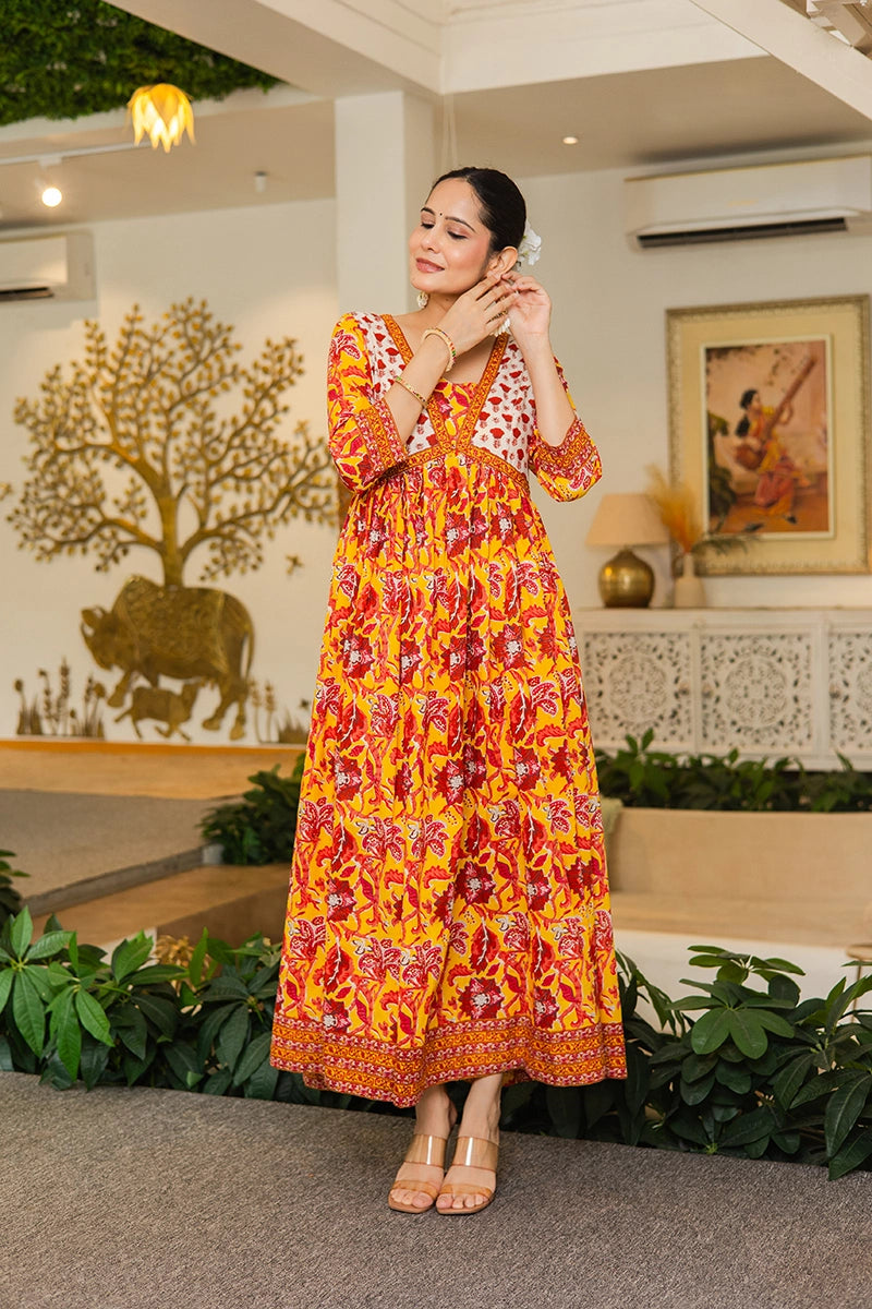 Mustard Flared Anarkali Cotton Kurta with Floral Print