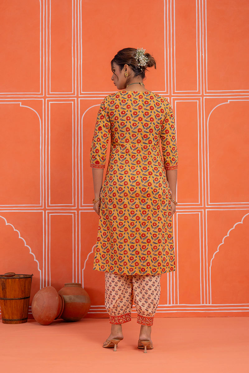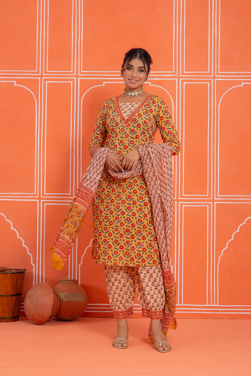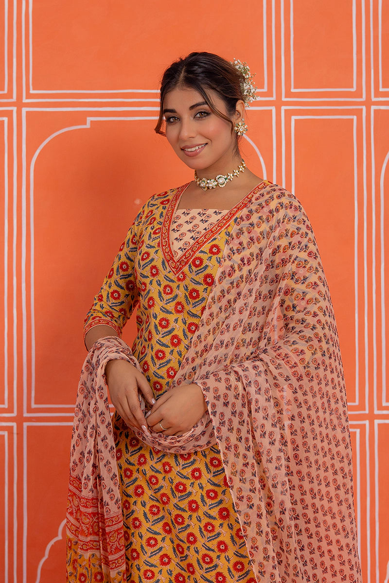 Mustard Floral Printed Hand Block Kurta Set with Chiffon Dupatta