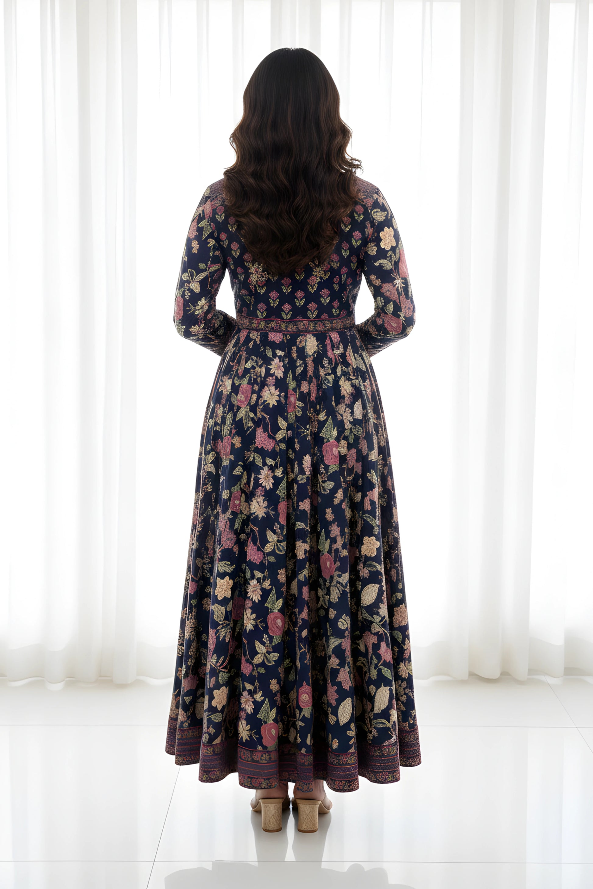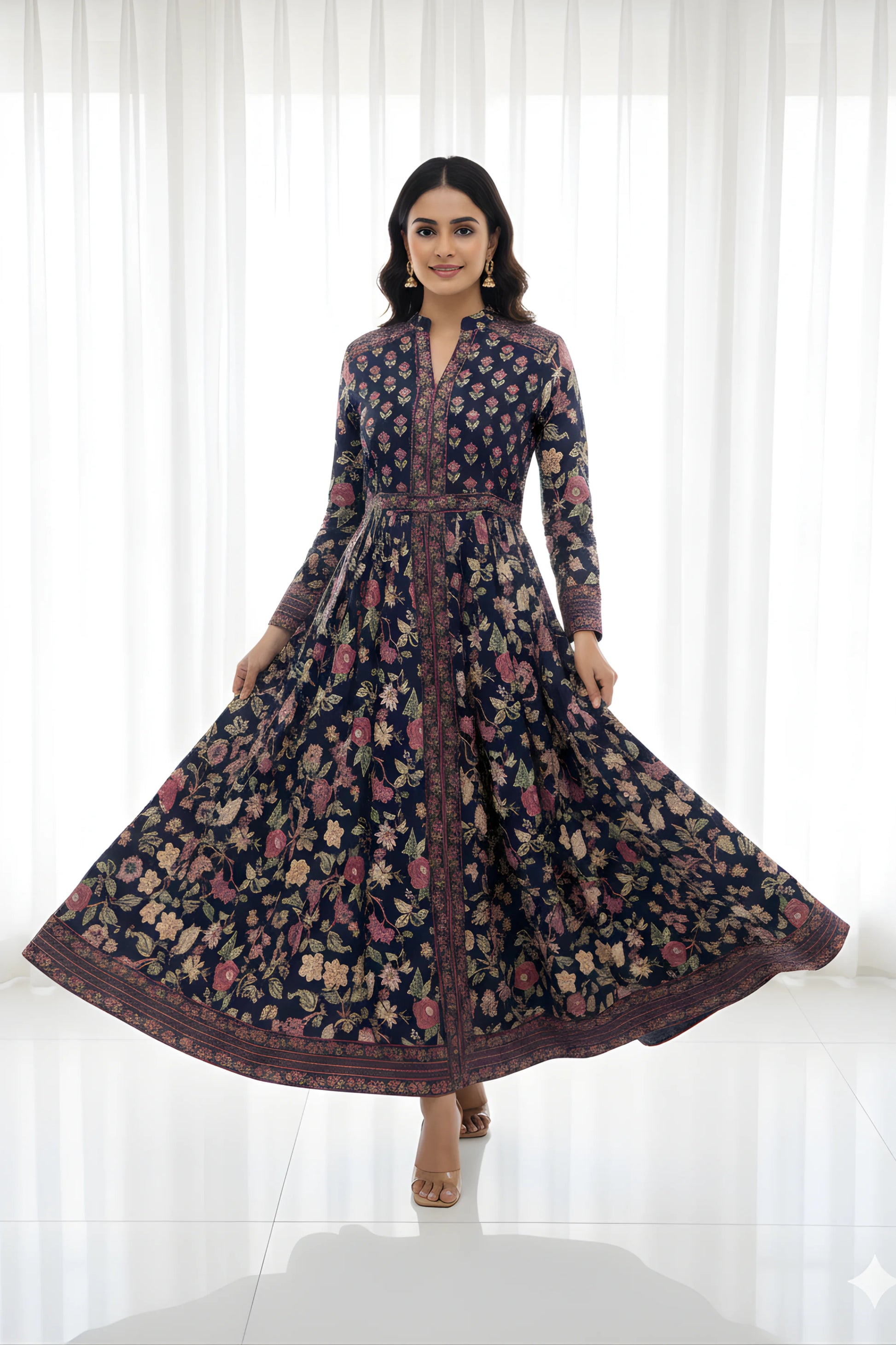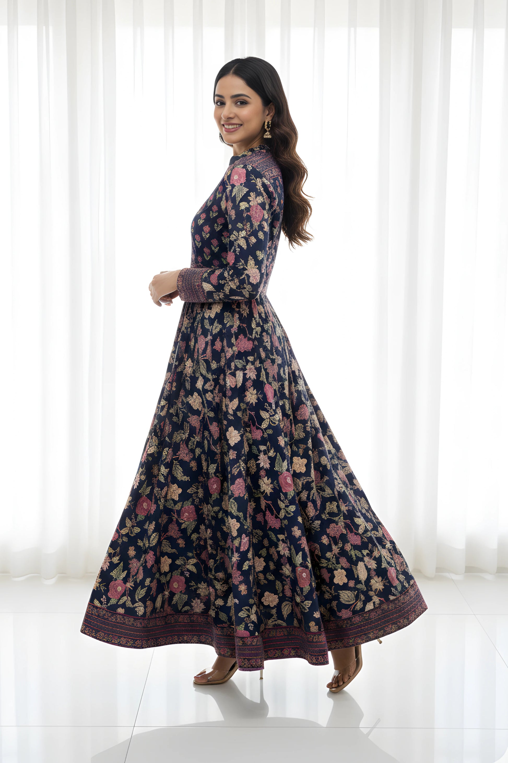 Navy Anarkali Cotton Hand Block Printed Ethnic Maxi Dress