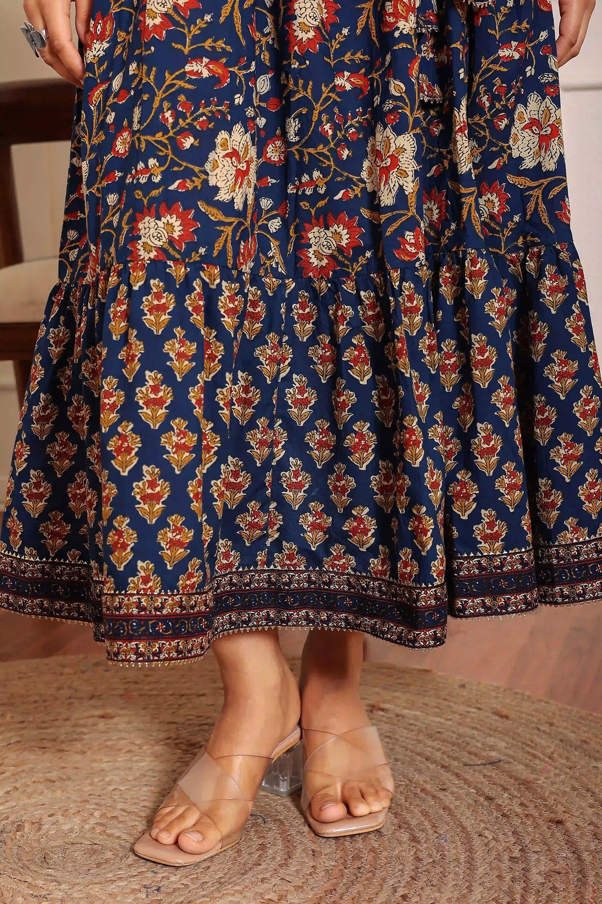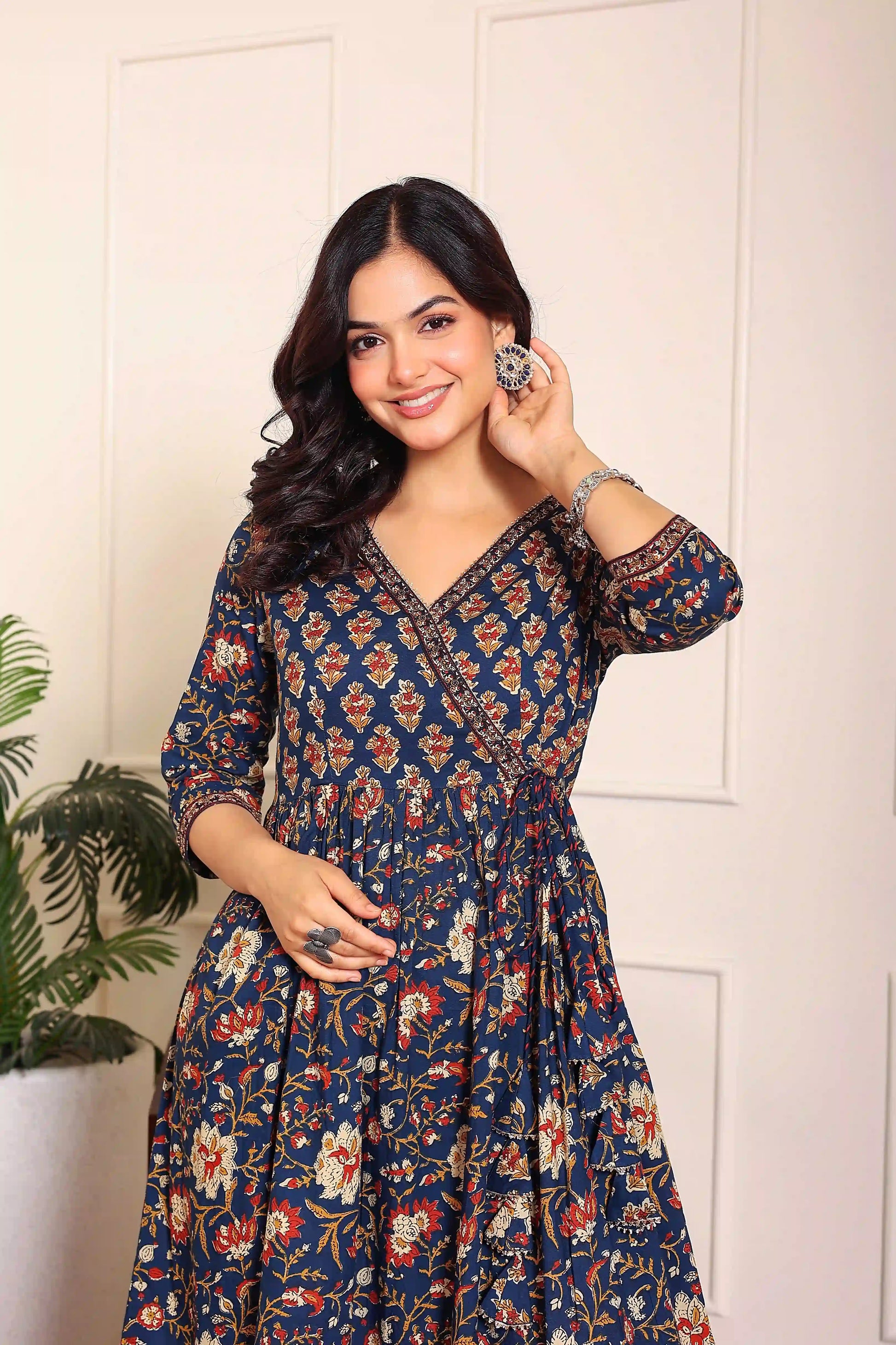 Gulab Chand Trends presents a Angrakha-style dress, beautifully adorned with hand prints. Crafted with a wrap-around design and flared silhouette, this Anarkali dress is perfect for festive celebrations and special occasions. Made from soft cotton fabric for all-day comfort and style. Pair it with ethnic accessories for a complete look.