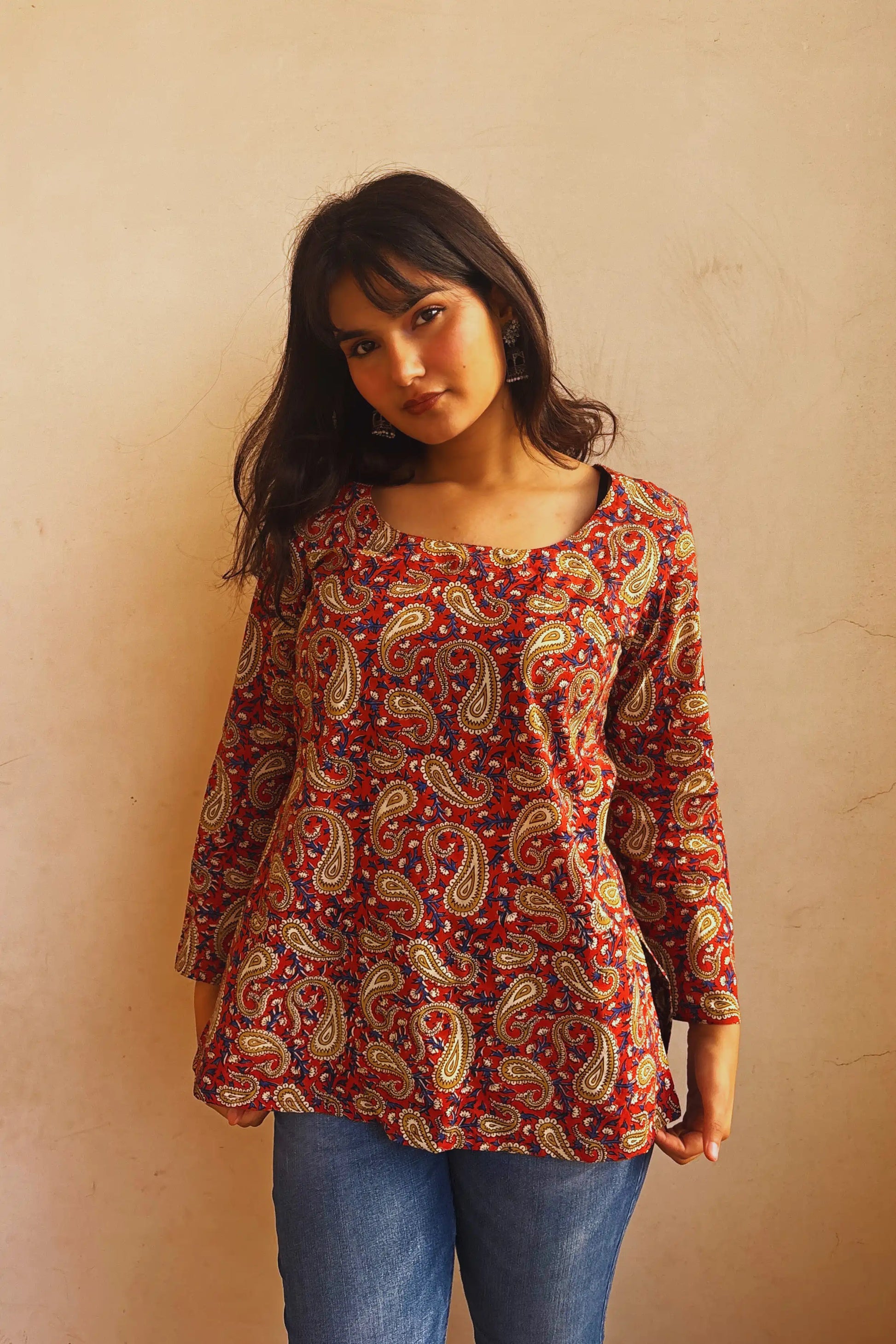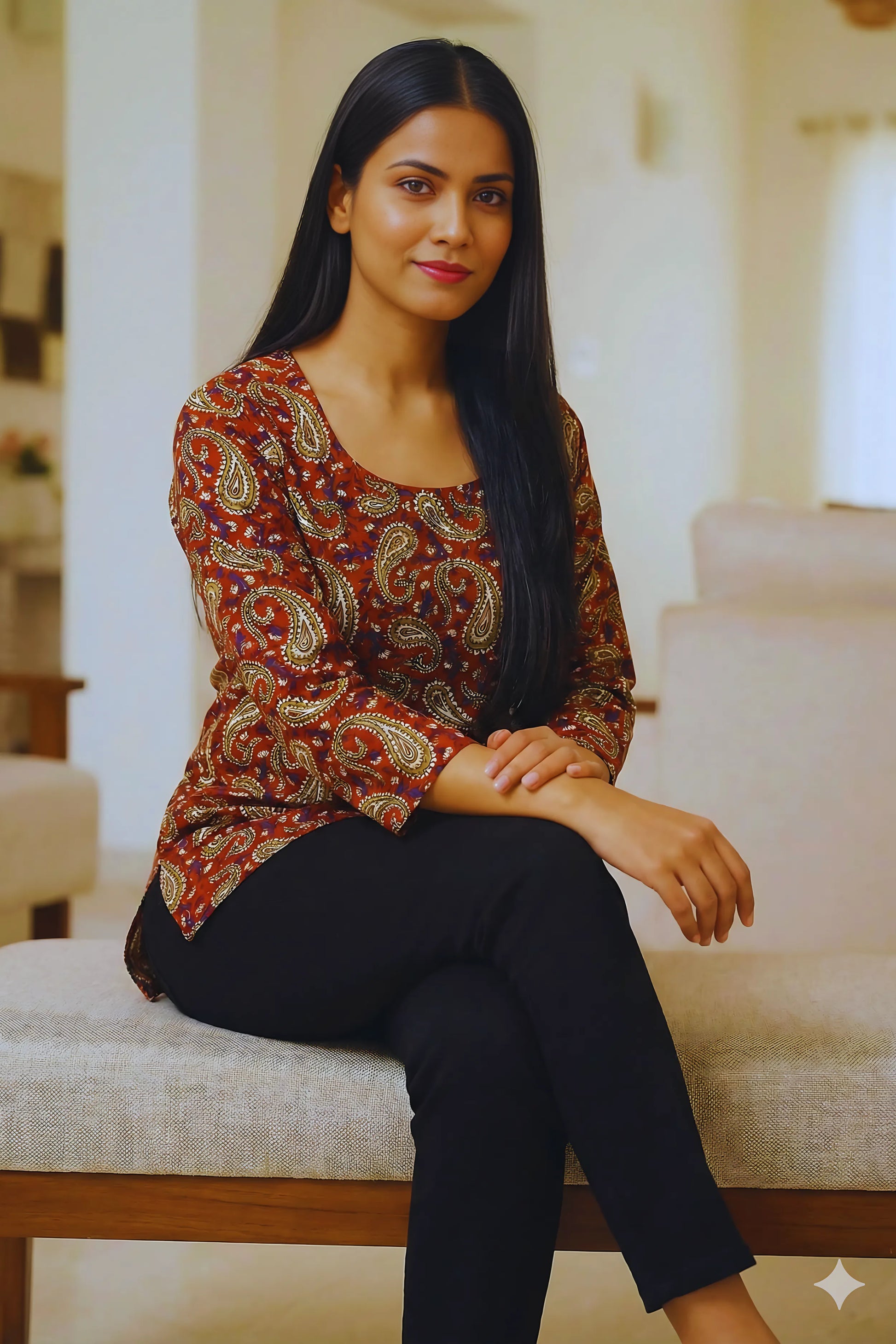 Stylish short kurti with an elegant all-over print, perfect to pair with jeans. Designed for daily wear with a comfortable fit and a clean neckline. Easy to style for work, casual outings, or everyday use. A smart fusion look that feels effortless and modern.