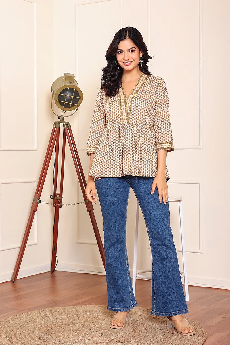 Gulab Chand Trends presents a cotton peplum top. Decorated with intricate hand prints, it features a flattering V-neck design and three-quarter sleeves. Perfect for casual outings or pairing with ethnic bottoms for a chic look.
